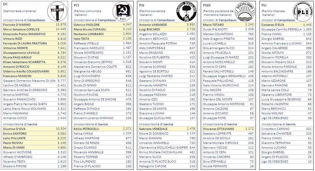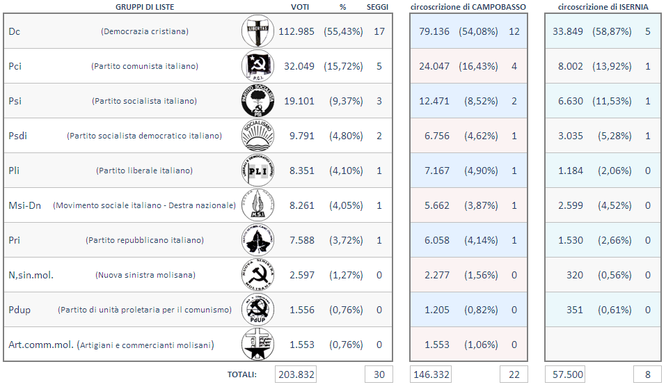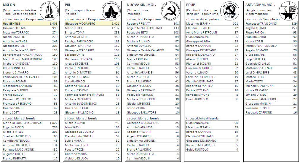 Dc Democrazia cristiana Pci Partito comunista italiano Psi Partito socialista italiano Psdi Partito socialista democratico italiano Pli Partito liberale italiano Msi-Dn Movimento sociale italiano - Destra nazionale Pri Partito repubblicano italiano N,sin.mol. Nuova sinistra molisana Pdup Partito di unità proletaria per il comunismo Art.comm.mol. Artigiani e commercianti molisani