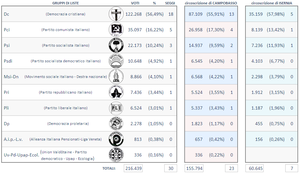 Dc Democrazia cristiana Pci Partito comunista italiano Psi Partito socialista italiano Psdi Partito socialista democratico italiano Msi-Dn Movimento sociale italiano - Destra nazionale Pri Partito repubblicano italiano Pli Partito liberale italiano Dp Democrazia proletaria A.i.p.-L.v. Alleanza Italiana Pensionati-Liga Veneta Uv-Pd-Upap-Ecol. Union Valdôtaine - Partito democratico - Upap - Ecologia