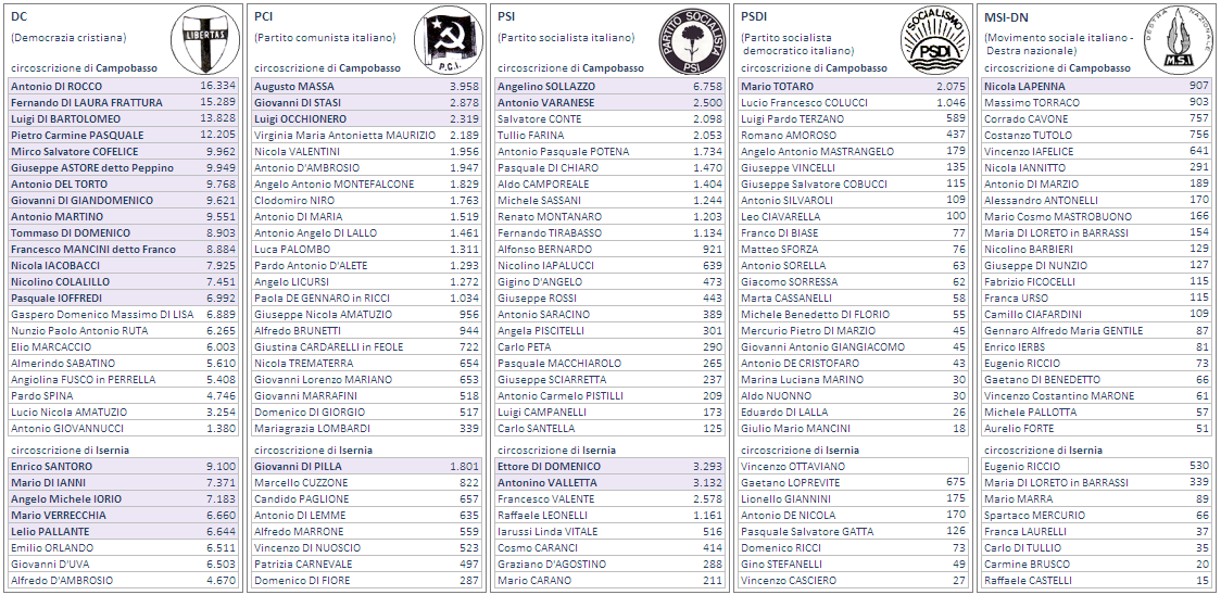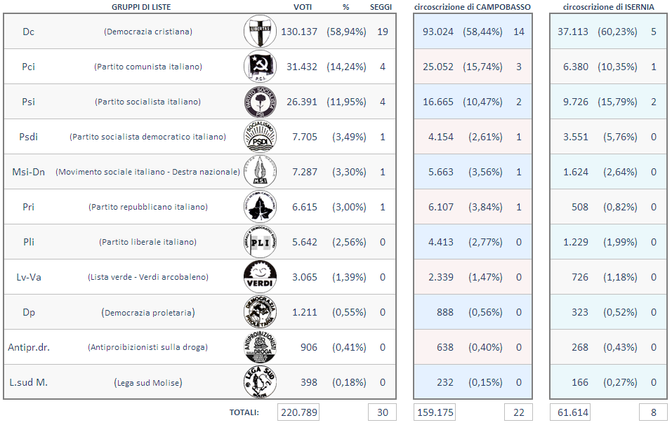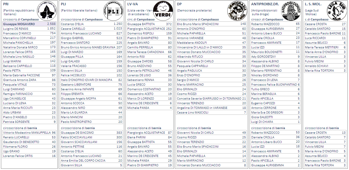 Dc Democrazia cristiana Pci Partito comunista italiano Psi Partito socialista italiano Psdi Partito socialista democratico italiano Msi-Dn Movimento sociale italiano - Destra nazionale Pri Partito repubblicano italiano Pli Partito liberale italiano Lv-Va Lista verde - Verdi arcobaleno Dp Democrazia proletaria Antipr.dr. Antiproibizionisti sulla droga L.sud M. Lega sud Molise