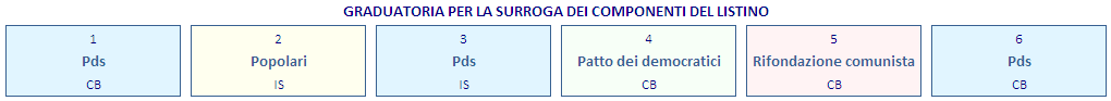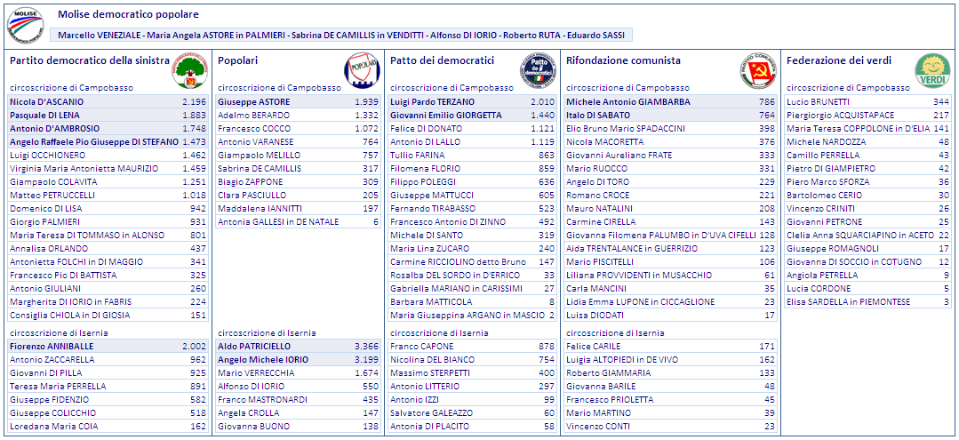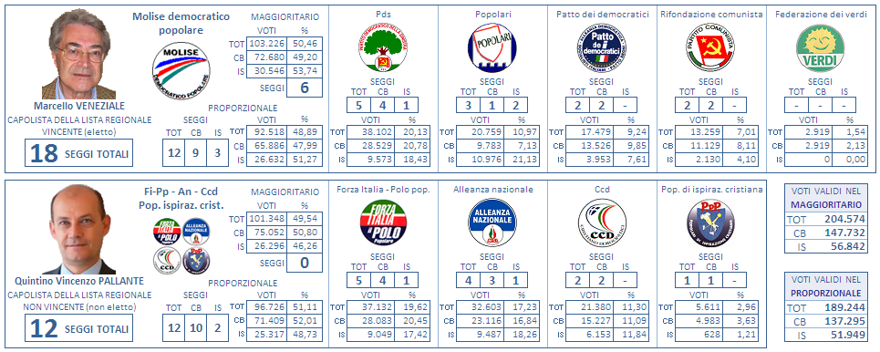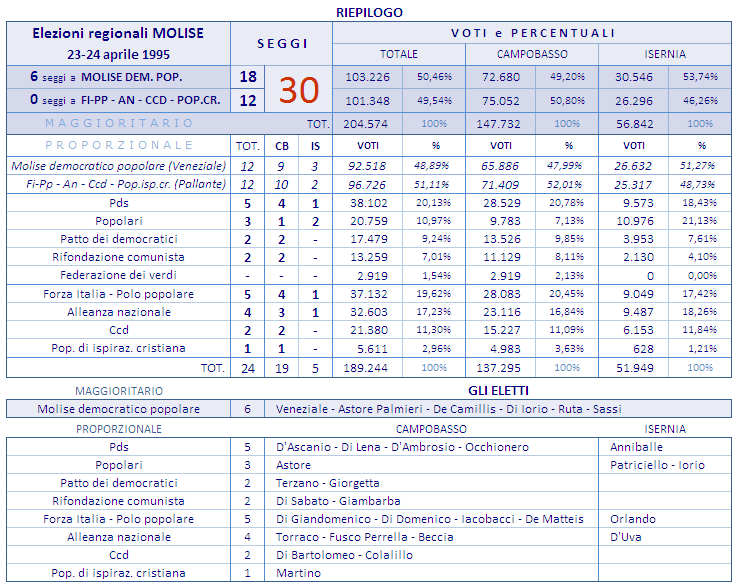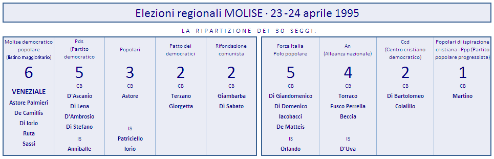 Elezioni regionali MOLISE 23 aprile 1995 Elezioni regionali MOLISE 23 - 24 aprile 1995 Campobasso Isernia Molise democratico popolare Partito democratico della sinistra Popolari Patto dei democratici Rifondazione comunista Federazione dei verdi Marcello VENEZIALE Maria Angela ASTORE in PALMIERI Sabrina DE CAMILLIS in VENDITTI Alfonso DI IORIO Roberto RUTA Eduardo SASSI Nicola D'ASCANIO Pasquale DI LENA Antonio D'AMBROSIO Luigi OCCHIONERO Virginia Maria Antonietta MAURIZIO Angelo Raffaele Pio Giuseppe DI STEFANO Giampaolo COLAVITA Matteo PETRUCCELLI Domenico DI LISA Giorgio PALMIERI Maria Teresa DI TOMMASO in ALONSO Annalisa ORLANDO Francesco Pio DI BATTISTA Antonietta FOLCHI in DI MAGGIO Antonio GIULIANI Margherita DI IORIO in FABRIS Consiglia CHIOLA in DI GIOSIA Fiorenzo ANNIBALLE Antonio ZACCARELLA Giovanni DI PILLA Teresa Maria PERRELLA Giuseppe FIDENZIO Giuseppe COLICCHIO Loredana Maria COIA Giuseppe ASTORE Adelmo BERARDO Francesco COCCO Antonio VARANESE Giampaolo MELILLO Sabrina DE CAMILLIS Biagio ZAPPONE Clara PASCIULLO Maddalena IANNITTI Antonia GALLESI in DE NATALE Aldo PATRICIELLO Angelo Michele IORIO Mario VERRECCHIA Alfonso DI IORIO Franco MASTRONARDI Angela CROLLA Giovanna BUONO Luigi Pardo TERZANO Giovanni Emilio GIORGETTA Felice DI DONATO Antonio DI LALLO Tullio FARINA Filomena FLORIO Filippo POLEGGI Giuseppe MATTUCCI Fernando TIRABASSO Francesco Antonio DI ZINNO Michele DI SANTO Maria Lina ZUCARO Carmine RICCIOLINO detto Bruno Rosalba DEL SORDO in D'ERRICO Gabriella MARIANO in CARISSIMI Barbara MATTICOLA Maria Giuseppina ARGANO in MASCIO Franco CAPONE Nicolina DEL BIANCO Massimo STERPETTI Antonio LITTERIO Antonio IZZI Antonia DI PLACITO Salvatore GALEAZZO Italo DI SABATO Michele Antonio GIAMBARBA Elio Bruno Mario SPADACCINI Nicola MACORETTA Giovanni Aureliano FRATE Mario RUOCCO Romano CROCE Angelo DI TORO Mauro NATALINI Carmine CIRELLA Giovanna Filomena PALUMBO in D'UVA CIFELLI Aida TRENTALANCE in GUERRIZIO Mario PISCITELLI Liliana PROVVIDENTI in MUSACCHIO Carla MANCINI Lidia Emma LUPONE in CICCAGLIONE Luisa DIODATI Felice CARILE Luigia ALTOPIEDI in DE VIVO Roberto GIAMMARIA Giovanna BARILE Francesco PRIOLETTA Mario MARTINO Vincenzo CONTI Lucio BRUNETTI Piergiorgio ACQUISTAPACE Maria Teresa COPPOLONE in D'ELIA Michele NARDOZZA Camillo PERRELLA Pietro DI GIAMPIETRO Piero Marco SFORZA Bartolomeo CERIO Vincenzo CRINITI Giovanni PETRONE Clelia Anna SQUARCIAPINO in ACETO Giuseppe ROMAGNOLI Angiola PETRELLA Giovanna DI SOCCIO in COTUGNO Lucia CORDONE Elisa SARDELLA in PIEMONTESE