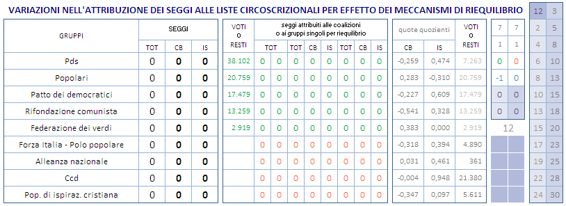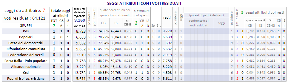 9. Divide, poi, la somma dei voti residuati di ogni gruppo di liste per tale quoziente: il risultato rappresenta il numero dei seggi da assegnare a ciascun gruppo. I seggi che rimangono ancora da attribuire sono rispettivamente assegnati ai gruppi per i quali queste ultime divisioni hanno dato maggiori resti e, in caso di parità di resti, a quei gruppi che abbiano avuto maggiori voti residuati. A parità anche di questi ultimi si procede a sorteggio.