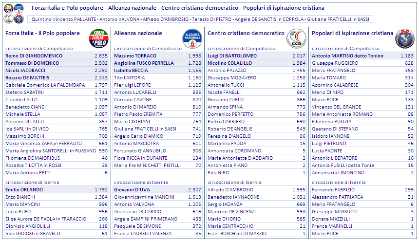 Elezioni regionali MOLISE 23 aprile 1995 Elezioni regionali MOLISE 23-24 aprile 1995 Campobasso Isernia Forza Italia - il Polo popolare Alleanza nazionale Centro cristiano democratico Popolari di ispirazione cristiana Quintino Vincenzo PALLANTE Antonio VALVONA Alfredo D'AMBROSIO Teresio DI PIETRO Angela DE SANCTIS in COPPOLA Giuliana FRATICELLI in SASSI Remo DI GIANDOMENICO Tommaso DI DOMENICO Nicola IACOBACCI Rosario DE MATTEIS Gabriele Domenico LA PALOMBARA Stefano SABATINI Claudio LALLO Benedetto CIANCI Michele STELLA Antonio DI LALLO Ida SARLI in DI VICO Massimo BORCHI Maria Vincenza ZARA in FERRAUTO Maria Angiolina SANTORELLI in RUSSANO Rosalba TILOTTA in ROSSI Filomena DE MAIORIBUS Maria Adriana PETTI Emilio ORLANDO Enzo BIANCHI Mario MANCINI Lucio RUFO Elisa Aurora DE PAOLA in FRARACCIO Dionisio ANGIOLILLI Ines GIOIOSI in GRAVELLI Massimo TORRACO Angiolina FUSCO PERRELLA Isabella BECCIA Tito LASTORIA Pierluigi LEPORE Antonio LUCARELLI Corrado CAVONE Antonio DI MARZIO Pietro Paolo EREMITA Mario CISTRIANI Giuliana FRATICELLI in SASSI Angelo Carlo D'AMICO Antonio MASCIOTRA Fortunato GIANNUBILO Flora RICCA in DURANTE Maria Pia MINICHETTI PISTILLI Giovanni D'UVA Giovannicarmine MANCINI Antonio VALVONA Anastasio TRICARICO Angela ZAMPINI PRIMERANO Pasquale DE SIMONE Franca LAURELLI VALENZA Luigi DI BARTOLOMEO Nicolino COLALILLO Antonio PALAZZO Giuseppe MOGAVERO Antonello TUCCI Nicola FANELLI Giovanni ZURLO Armando SPINA Domenico PERFETTO Pietro CARRIERO Roberto DE ANGELIS Teresina D'ANGELO Marianna FADDA Annunziata COROMANO Maria Antonietta D'ADDARIO Rita NIRO Antonietta PIANO Alfredo D'AMBROSIO Benedetto IANNACONE Sergio IADANZA Maurizio DE VINCENZI Mario DI IORIO Maria CENTRACCHIO Ester BOSCHI in DI MARZIO Antonio MARTINO detto Tonino Giuseppe RUGGIERO Mario FRATANGELO Maria TOMARO Adornino CALABRESE Mario DI NIRO Antonio LIBERATORE Mario POCE Vincenzo DEL GRANDE Filomena POLIZIA Gaetano DI STEFANO Isidoro IANNONE Luigi PIETRUNTI Lucia FAONTE Maria Antonietta ROMANO Antonia FUSILLI detta Tonia Annamaria LIMONCINO Fernando FABRIZIO Alessandro PATRIARCA Mario FRATANGELO Giuseppe MASSUCCI Franca MARINELLI Mario POCE Donata MAZZILLI