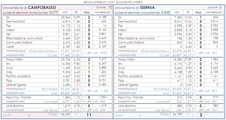Elezioni regionali Molise 16 aprile 2000 a cura di Roberto Di Sario circoscrizione di Campobasso circoscrizione di Isernia eletti voti quozienti interi voti residuati preferenze gruppi di liste quoziente elettorale circoscrizionale quoziente elettorale regionale preferenze