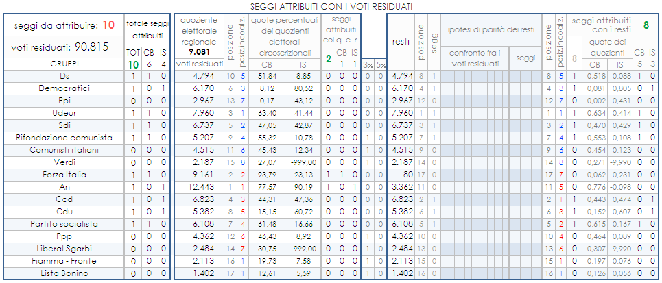 10. I seggi spettanti a ciascun gruppo di liste vengono attribuiti alle rispettive liste nelle singole circoscrizioni seguendo la graduatoria decrescente dei voti residuati espressi in percentuale del relativo quoziente circoscrizionale. A tal fine si moltiplica per cento il numero dei voti residuati di ciascuna lista e si divide il prodotto per il quoziente circoscrizionale.