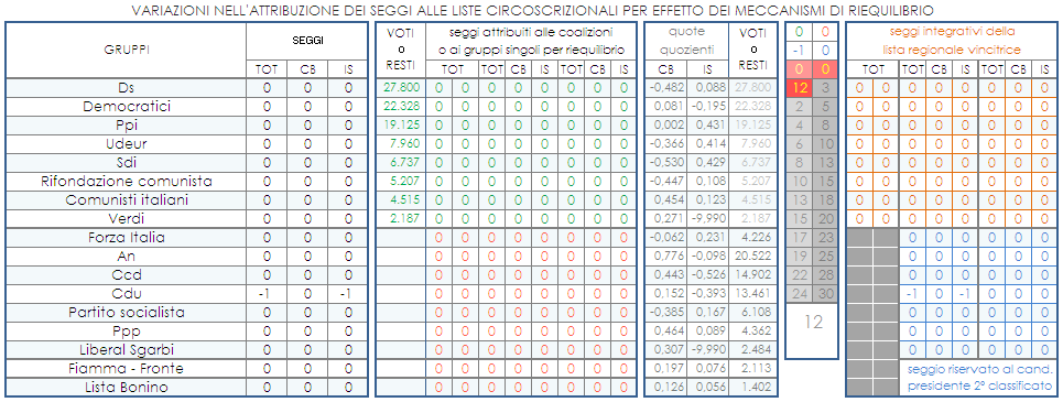 1) determina in primo luogo la cifra elettorale regionale attribuita a ciascuna lista regionale, sommando le cifre elettorali ad essa attribuite ai sensi del terzo comma, lettera a); individua altresì il totale dei seggi assegnati ai sensi dei commi precedenti al gruppo di liste o ai gruppi di liste provinciali collegati a ciascuna lista regionale;