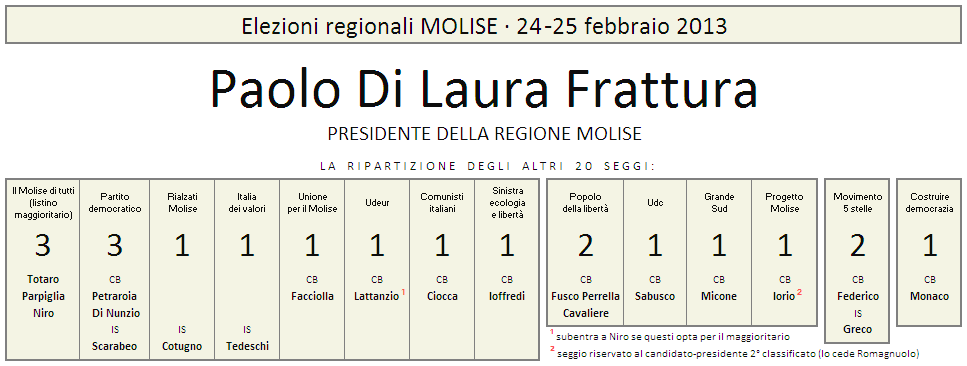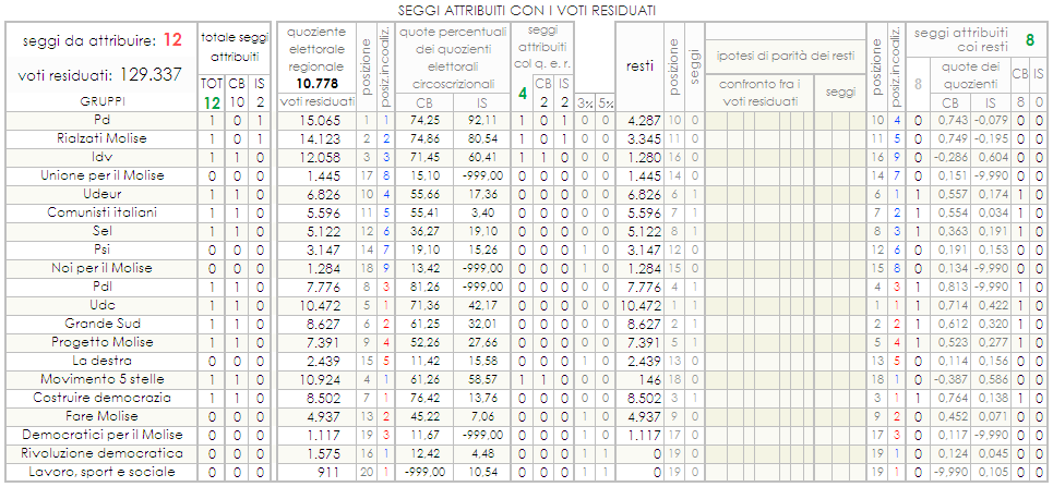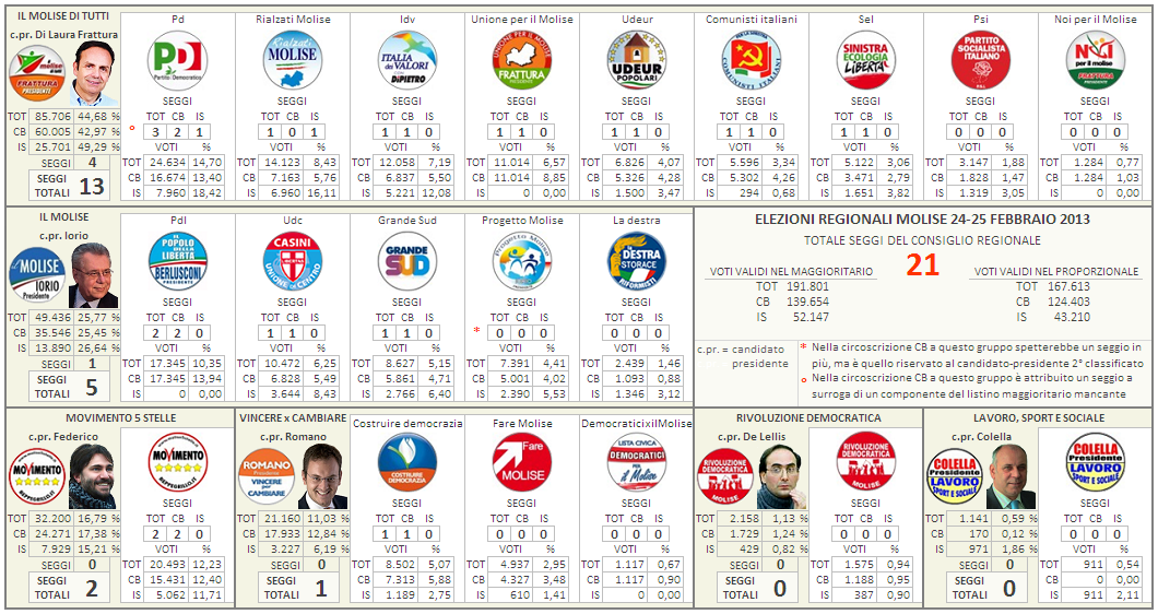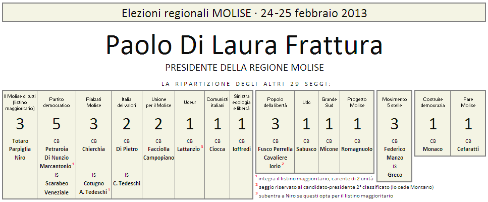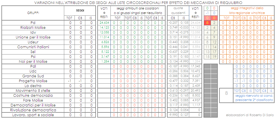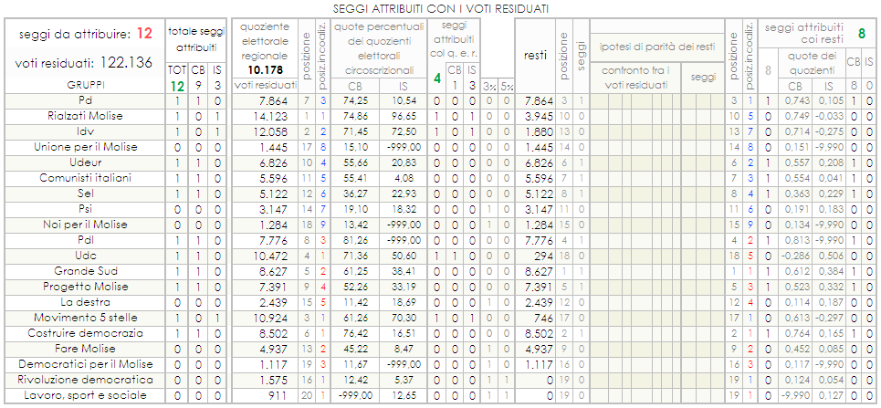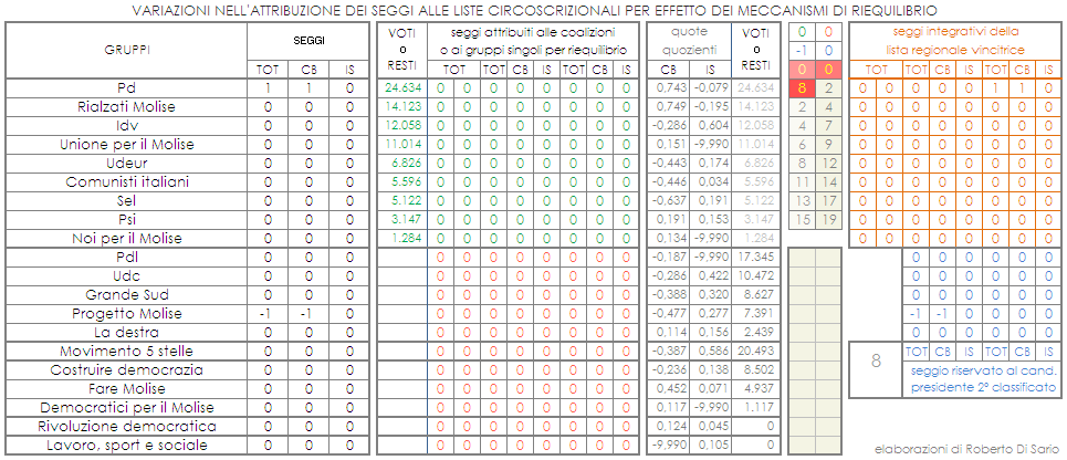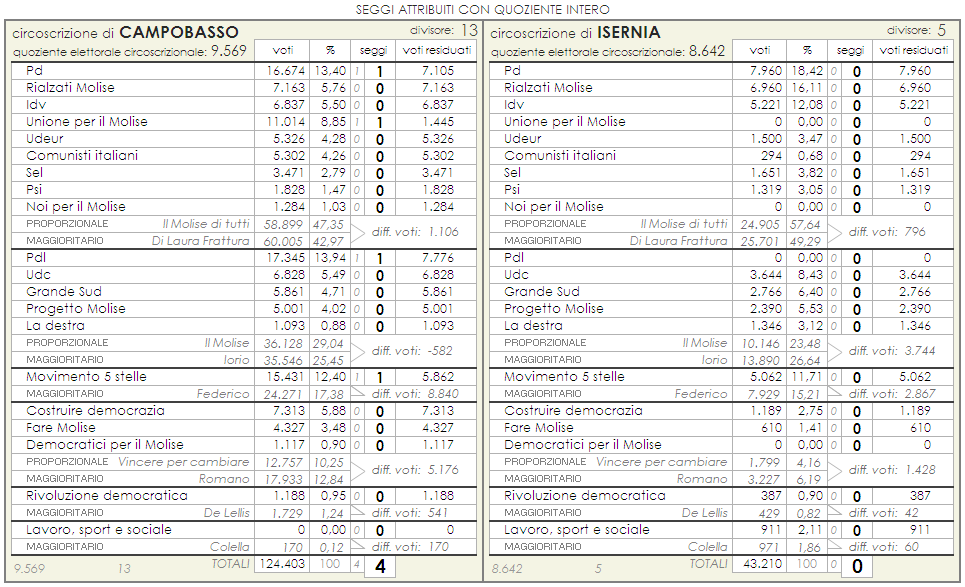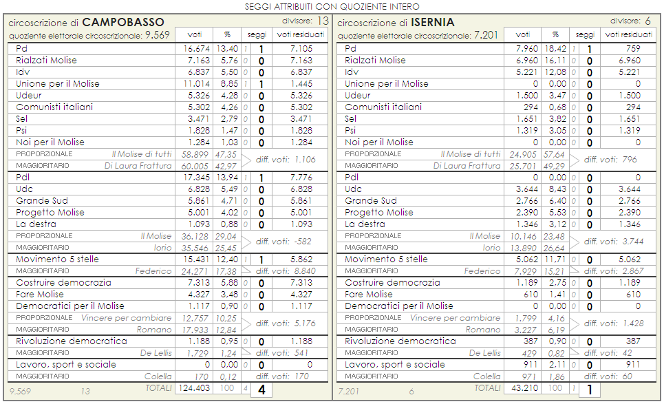 Si riportano qui sotto la composizione del consiglio regionale molisano che deriverebbe da tale interpretazione e i relativi schemi di calcolo. Le differenze rispetto al risultato ufficiale si traducono sostanzialmente: 1) nell’elezione a consigliere del candidato Domenico Di Nunzio (secondo nella graduatoria delle preferenze della lista provinciale campobassana “Partito democratico”) non più come surrogante del quinto componente (mancante) del listino maggioritario “Il Molise di tutti” (candidato presidente Paolo Di Laura Frattura) ma in quanto la lista provinciale campobassana “Partito democratico” otterrebbe due seggi anziché uno; 2) nell’attribuzione alla circoscrizione di Isernia anziché a quella di Campobasso del seggio ottenuto dal gruppo di liste provinciali “Italia dei valori” collegato al candidato presidente Paolo Di Laura Frattura con conseguente elezione a consigliere regionale di Cosmo Tedeschi, candidato col maggior numero di preferenze nella lista provinciale isernina, in luogo di Cristiano Di Pietro, candidato col maggior numero di preferenze nella lista provinciale campobassana; 3) nell’attribuzione alla circoscrizione di Isernia anziché a quella di Campobasso del secondo dei due seggi ottenuti dal gruppo di liste provinciali “Movimento 5 stelle” collegato al candidato presidente Antonio Federico con conseguente elezione a consigliere regionale di Andrea Greco, candidato col maggior numero di preferenze nella lista provinciale isernina, in luogo di Patrizia Manzo, piazzatasi al secondo posto nella graduatoria delle preferenze della lista provinciale campobassana.