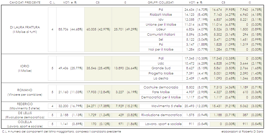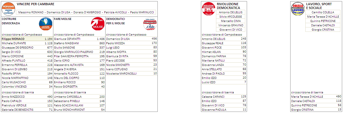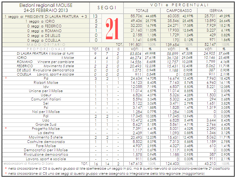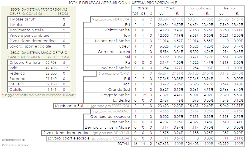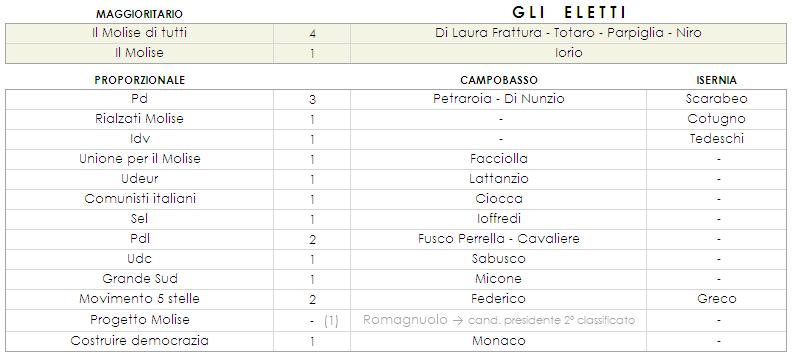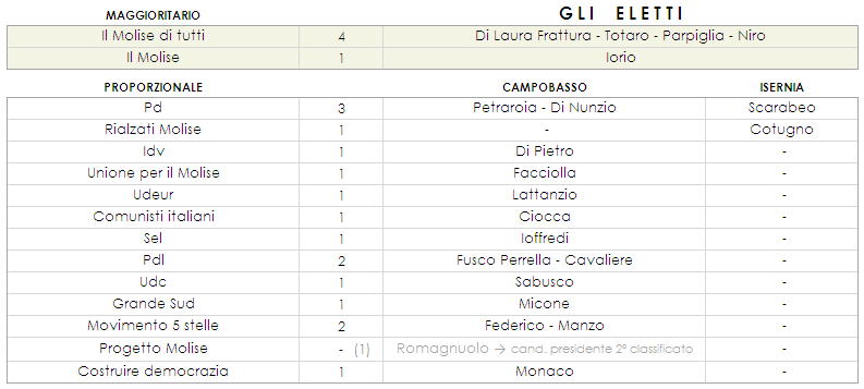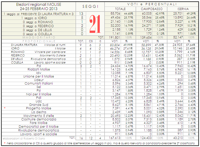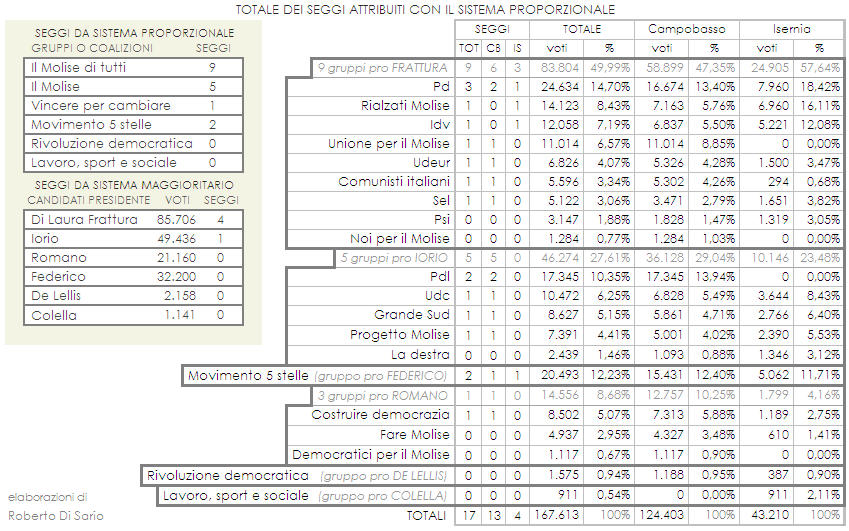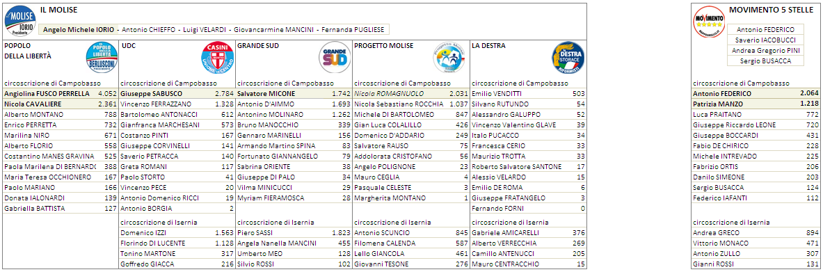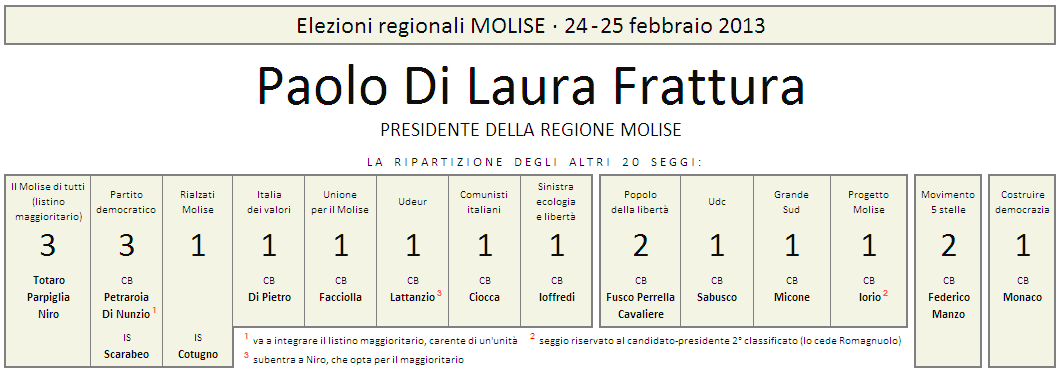 Si riportano qui sotto la composizione del consiglio regionale molisano che deriverebbe da tale interpretazione e i relativi schemi di calcolo. Le differenze rispetto al risultato ufficiale si traducono sostanzialmente: 1) nell’elezione a consigliere del candidato Domenico Di Nunzio (secondo nella graduatoria delle preferenze della lista provinciale campobassana “Partito democratico”) non più come surrogante del quinto componente (mancante) del listino maggioritario “Il Molise di tutti” (candidato presidente Paolo Di Laura Frattura) ma in quanto la lista provinciale campobassana “Partito democratico” otterrebbe due seggi anziché uno; 2) nell’attribuzione alla circoscrizione di Isernia anziché a quella di Campobasso del seggio ottenuto dal gruppo di liste provinciali “Italia dei valori” collegato al candidato presidente Paolo Di Laura Frattura con conseguente elezione a consigliere regionale di Cosmo Tedeschi, candidato col maggior numero di preferenze nella lista provinciale isernina, in luogo di Cristiano Di Pietro, candidato col maggior numero di preferenze nella lista provinciale campobassana; 3) nell’attribuzione alla circoscrizione di Isernia anziché a quella di Campobasso del secondo dei due seggi ottenuti dal gruppo di liste provinciali “Movimento 5 stelle” collegato al candidato presidente Antonio Federico con conseguente elezione a consigliere regionale di Andrea Greco, candidato col maggior numero di preferenze nella lista provinciale isernina, in luogo di Patrizia Manzo, piazzatasi al secondo posto nella graduatoria delle preferenze della lista provinciale campobassana.