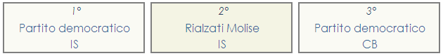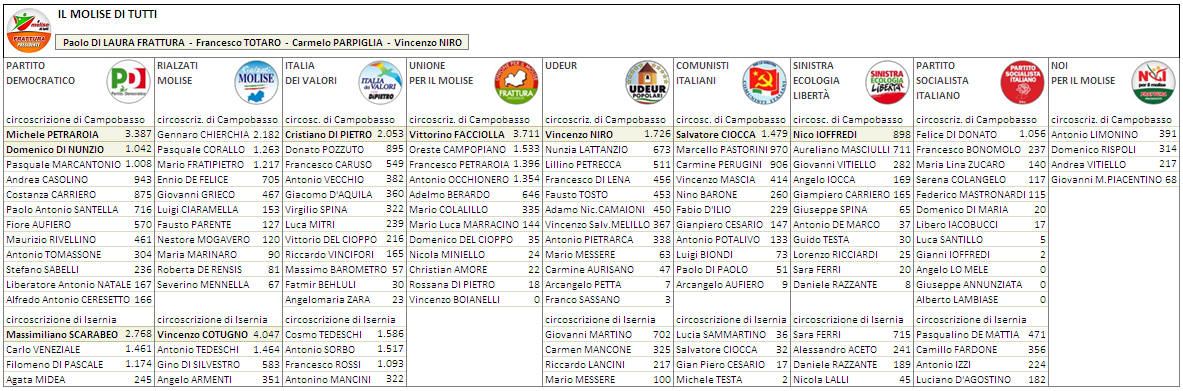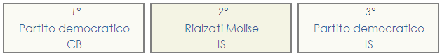 COMUNISTI ITALIANI COSTRUIRE DEMOCRAZIA DEMOCRATICI PER IL MOLISE FARE MOLISE GRANDE SUD IL MOLISE IL MOLISE DI TUTTI ITALIA DEI VALORI LA DESTRA LAVORO, SPORT E SOCIALE MOVIMENTO CINQUE STELLE NOI PER IL MOLISE PARTITO DEMOCRATICO PARTITO SOCIALISTA ITALIANO POPOLO DELLA LIBERTÀ PROGETTO MOLISE RIALZATI MOLISE RIVOLUZIONE DEMOCRATICA SINISTRA ECOLOGIA E LIBERTÀ UDC UDEUR UNIONE PER IL MOLISE VINCERE PER CAMBIARE
